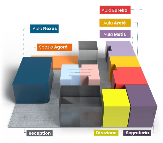 Aule luminose e attrezzate con le più moderne tecnologie didattiche accolgono i nostri corsisti, offrendo un ambiente ideale per lezioni frontali, workshop e attività di gruppo. Ma la formazione non si limita alle quattro mura: ampi spazi comuni, come le zone relax, favoriscono l’interazione e lo scambio di idee tra studenti, docenti e professionisti del settore.